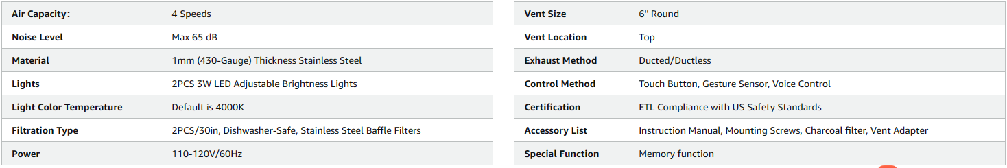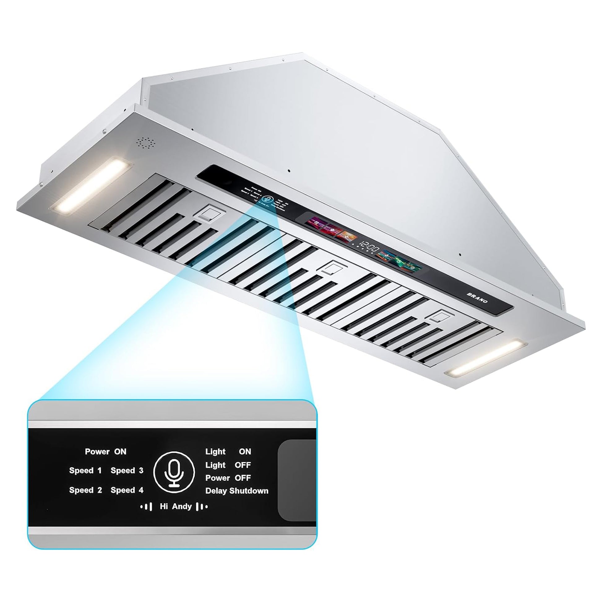 - 【Voice/Gesture/Touch Control】BRANO professional smart built in range hood offers easy and convenient voice, gesture, and touch control. Unique voice control frees your hands in the busy cooking process. The two adjustable LED lights, 3-minute delay shutdown, and 15-minute adjustable timer offer flexible control for your cooking needs.