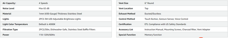 - 【Flexible Ventilation】BRANO kitchen range hood offers two installation options for outdoor or indoor ventilation, with a default top-ducted 6" round exhaust vent. It comes with a replaceable activated carbon filter for non-ducted installations, ensuring efficient and optimal airflow for your entire kitchen.