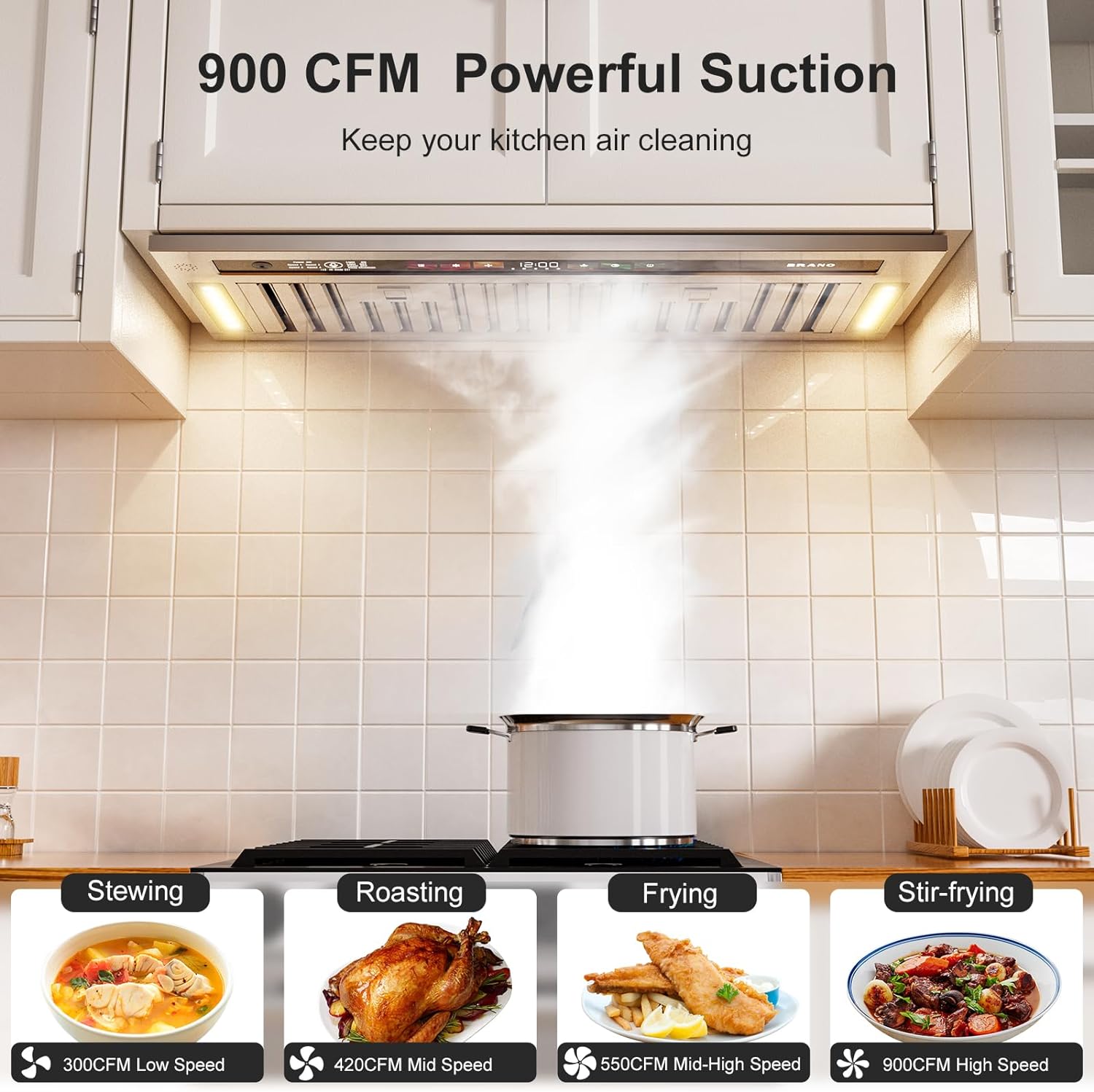 - 【900 CFM Superb Suction】BRANO inserts range hood 30 inch is equipped with 4-speed modes, with a maximum suction of 900 CFM. It's suitable for all cooking modes and can remove most smoke and cooking odors at first time, keeping your kitchen air fresh. If you want an effective range hood, don't miss Brano.